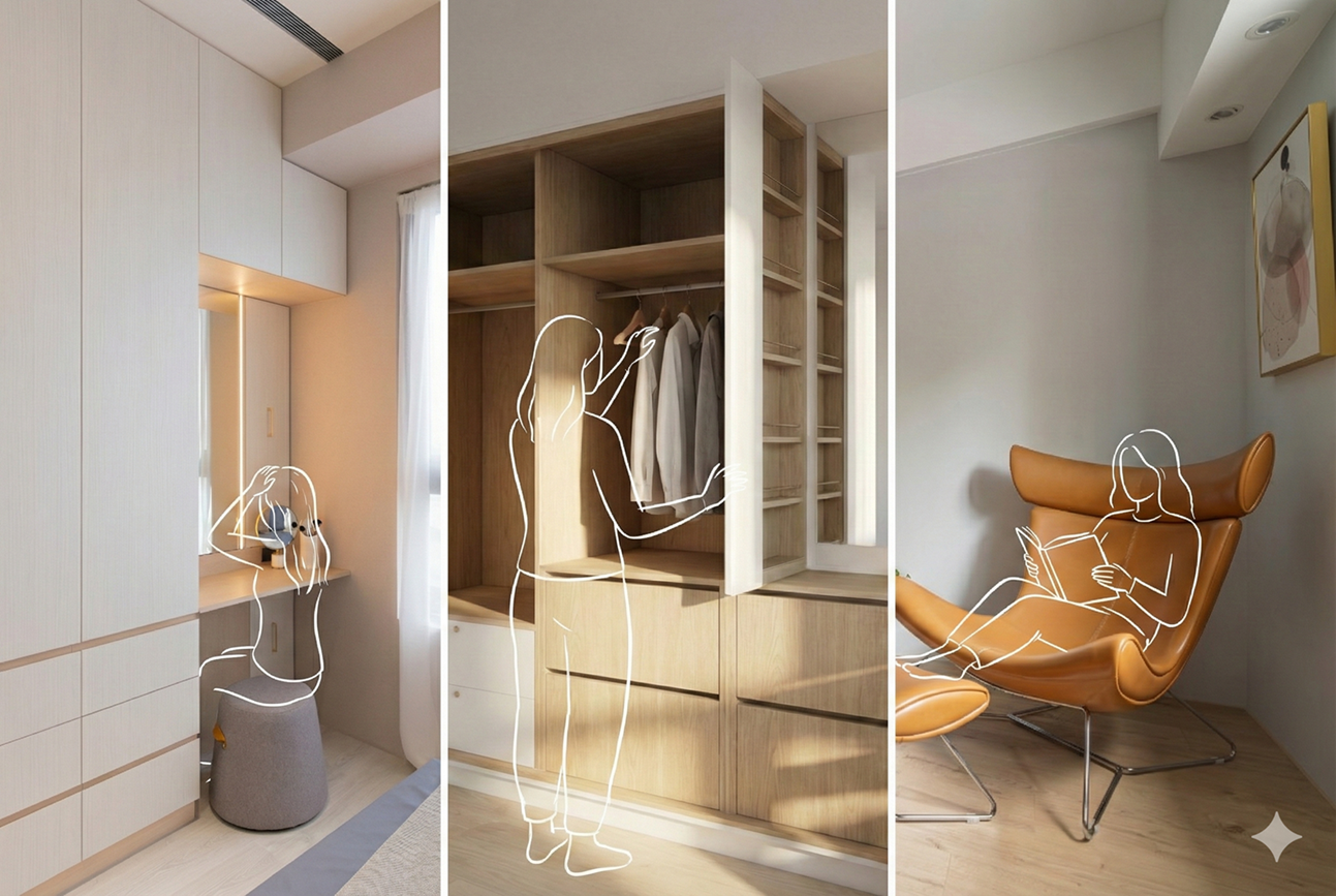 • 風水考量: 如果在意鏡子對床,可以設計「滑門」或「摺疊鏡」將鏡面隱藏。