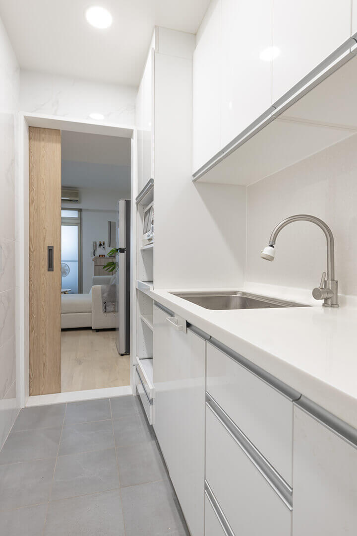 廚房櫃體針對需求規劃出符合屋主的系統櫃體,讓鍋碗瓢盆及電器用品都有適合的位置。