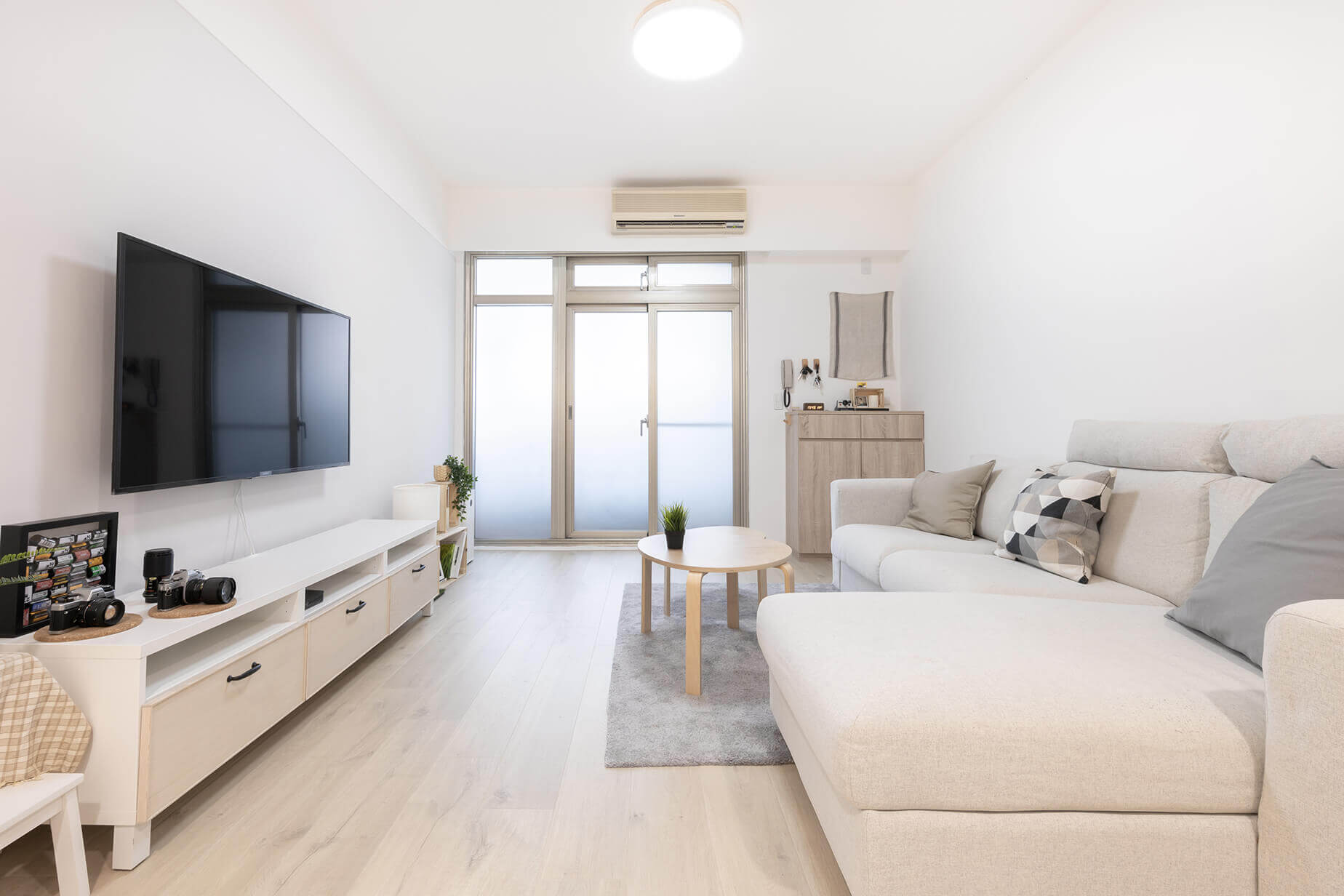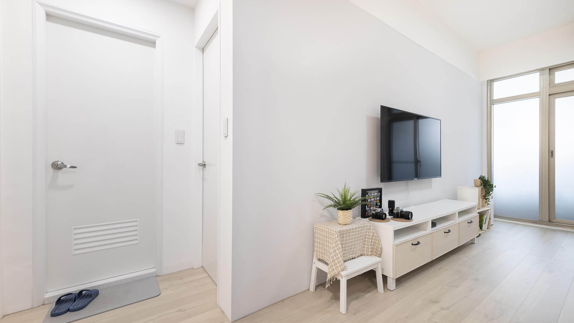 拉深既有入口,延伸客廳電視主牆,不只增加主臥收納空間,也讓客廳區室內空間加深。