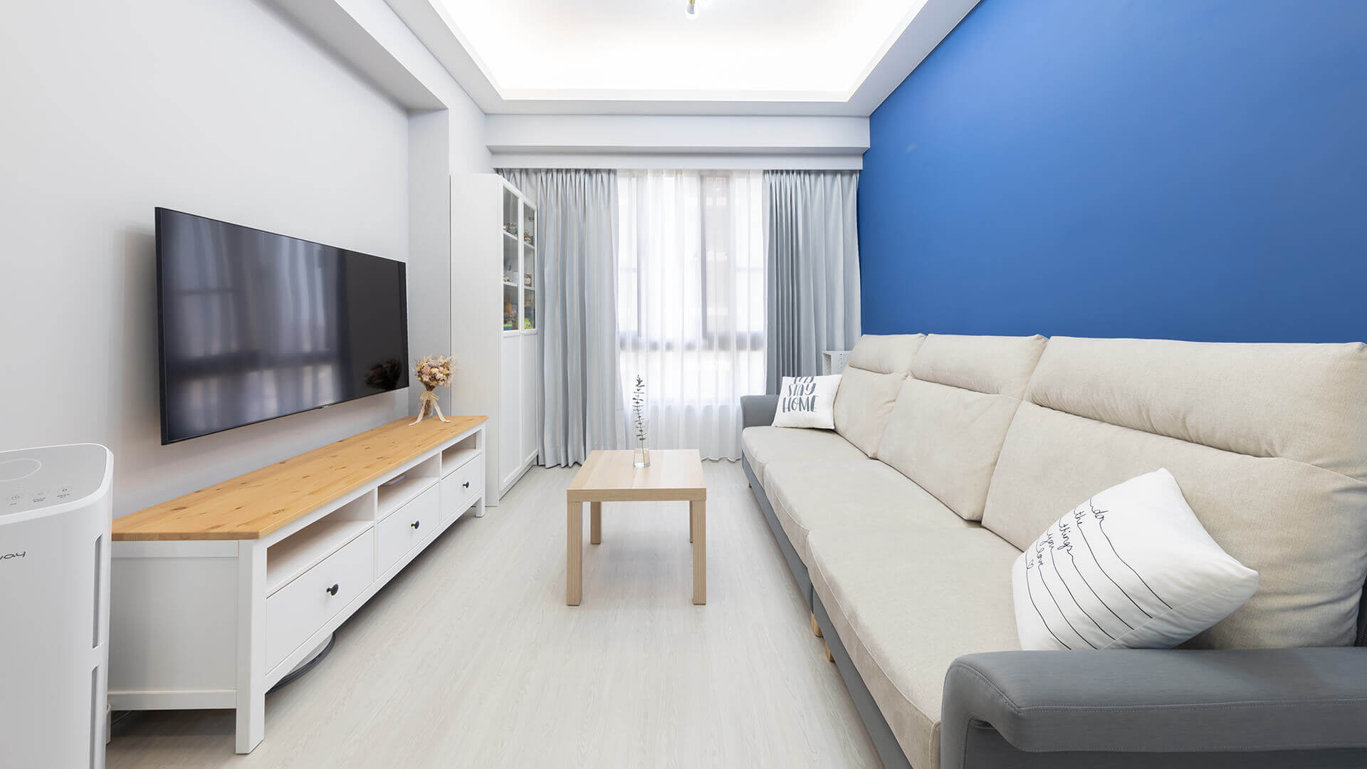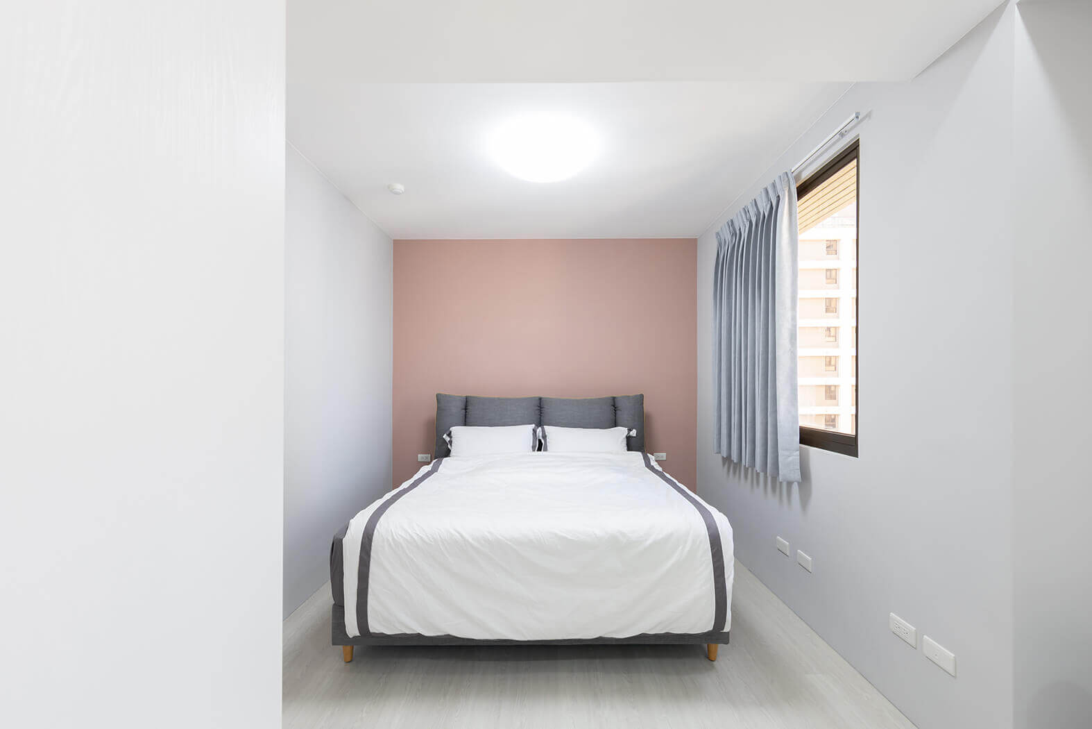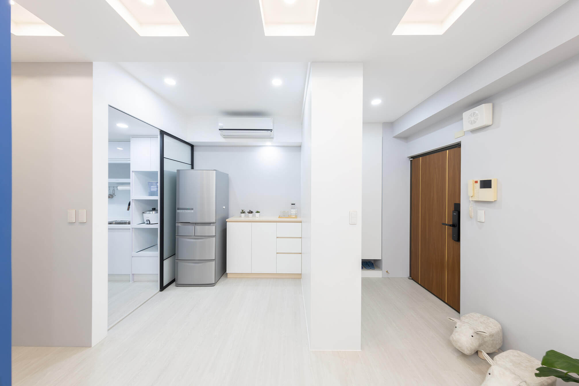 本次舊翻新裝修,大致的空間隔間無太大異動,我們調整了局部的設備動線並增加大量的收納空間,因主底為白/灰色系,部份主牆搭配屋主喜愛的色調,讓主空間增添個性。