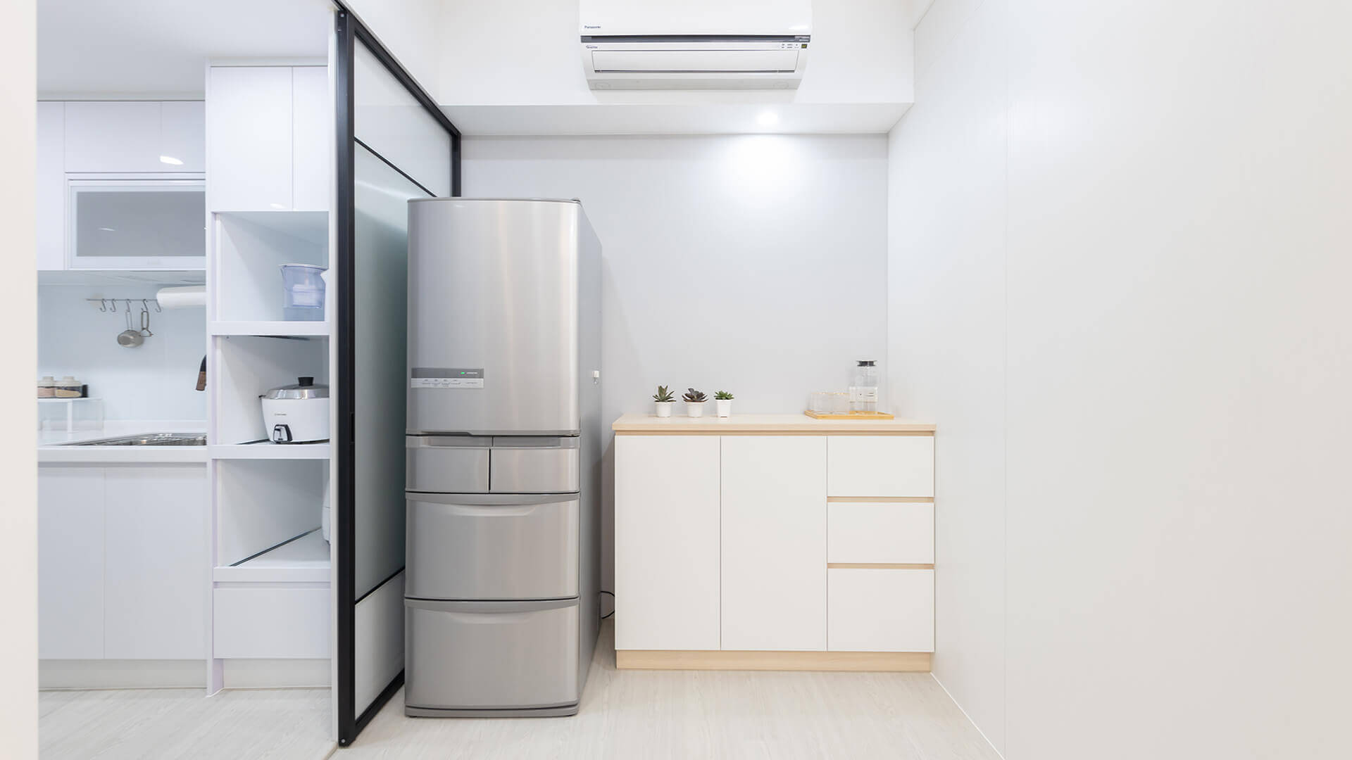 因屋主習慣在客廳用餐的關係,我們在原餐廳區增加其收納並把冰箱放置此區,偶爾要拿取飲品更加便利。