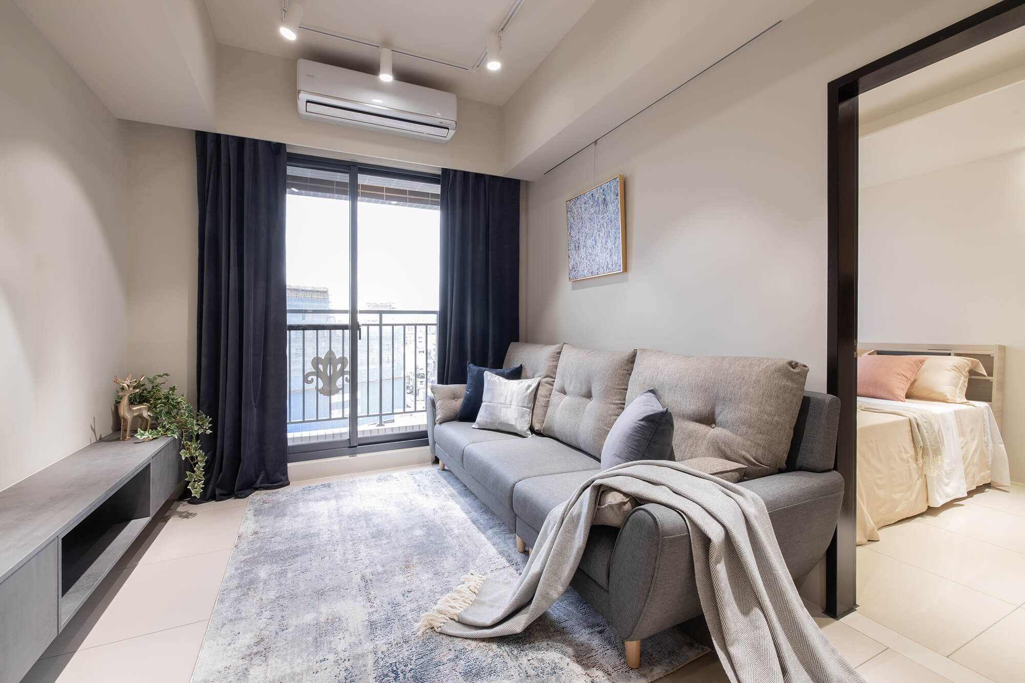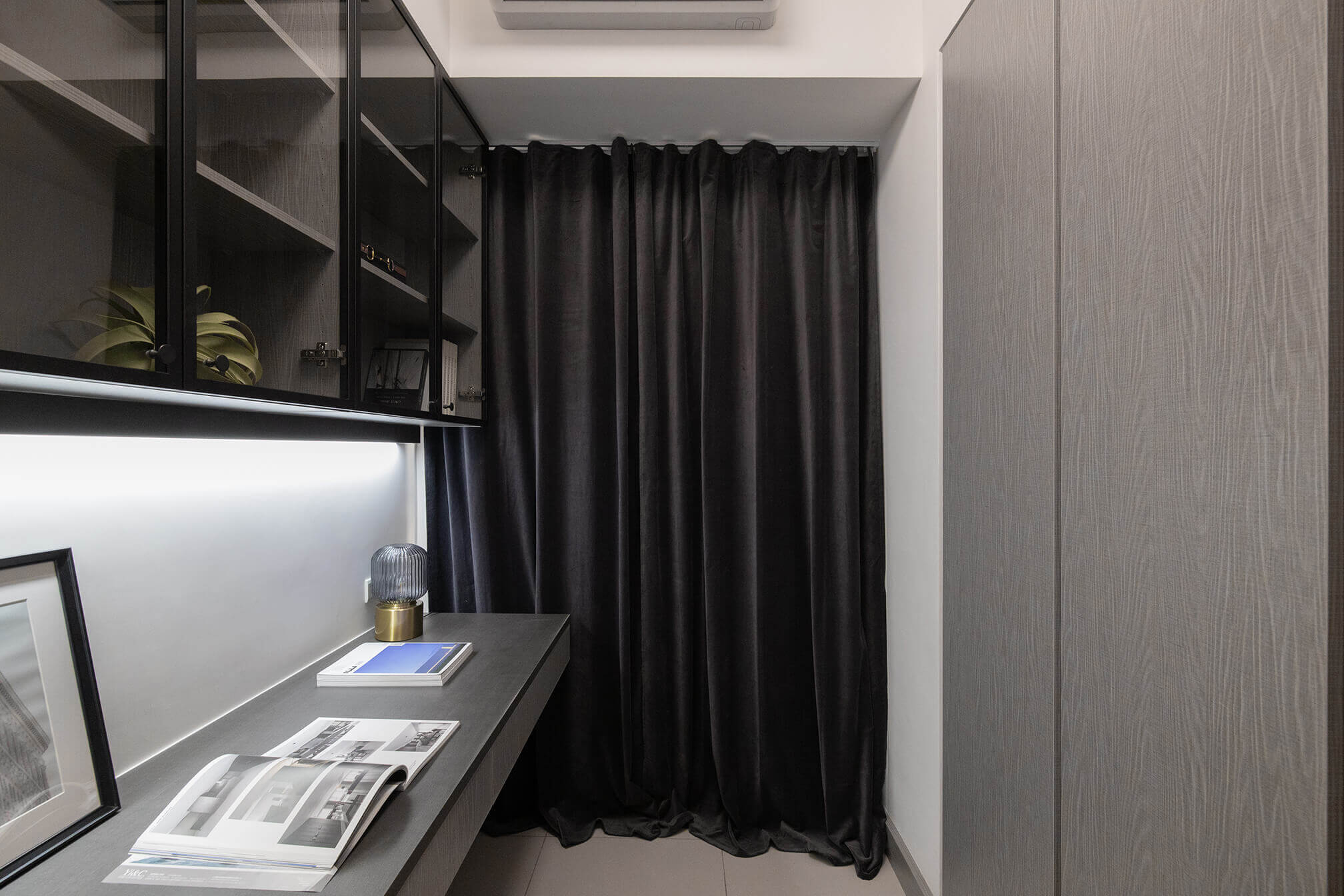 與公領域相同採用黑白灰配色,搭配細鋁框玻璃門片,讓整體質感提升,2米4的大書桌不僅可以閱讀用,還可轉變成電競間,滿足屋主三台電腦同時使用,插座數量也是多到不要不要的~~