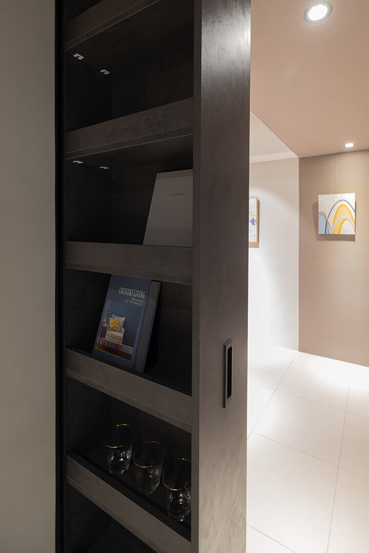 輔以特殊五金收納摺疊桌,增加空間的彈性機能,可變化成運動空間or辦公閱讀空間or聚會空間,餐櫃中段簍空與旁邊使用細鋁框黑玻璃門片,讓整個櫃體雖然夠深但是不壓迫