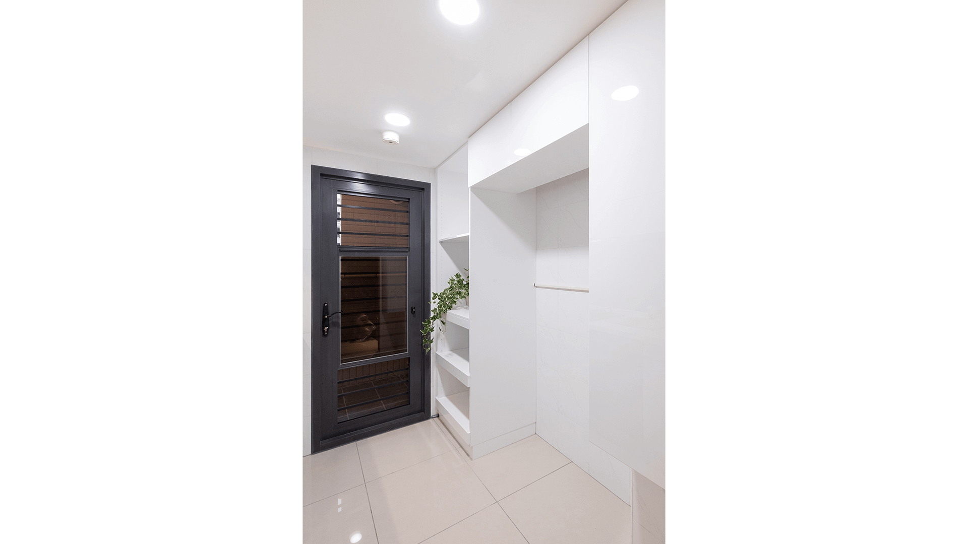 本案子為小三房的格局,色彩以黑白灰組成的空間,以咖啡色牆面分隔出廊道與餐廳空間,廊道以訂製金屬洞洞橫拉門片隱藏開關箱,增加掛物機能