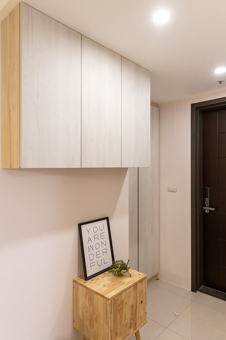 原玄關廊道空間寬大,保留原有空間,因只有二人居住,鞋量不多,所以在電箱位置設計鞋櫃及收納櫃,另增加穿鞋區,好讓進出時都有可歇息的地方。