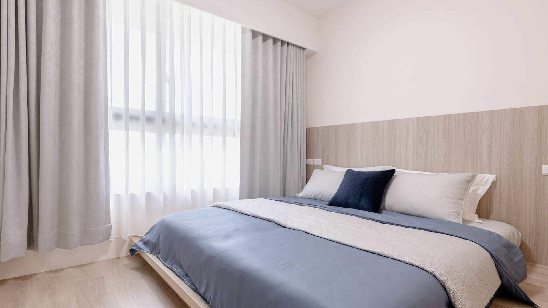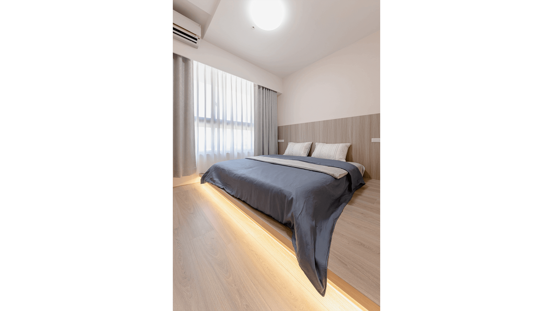 原本屋主的家,主臥就為架高地板,但因床墊放在地板上,上下床時周邊都沒可伸腳的空間,可以說是爬著出來,非常不方便,經討論屋主二人的睡眠習慣不同,希望為二張併在一起的單人床,所以我們這次的設計為二單人電動床,可不同以往,可以舒適在床上看電視,另利用架高地板下方可增設夜間照地燈(依屋主的身高來設定總高度),讓屋主可輕鬆在床尾下床,晚上也不會因為太暗而跌倒。