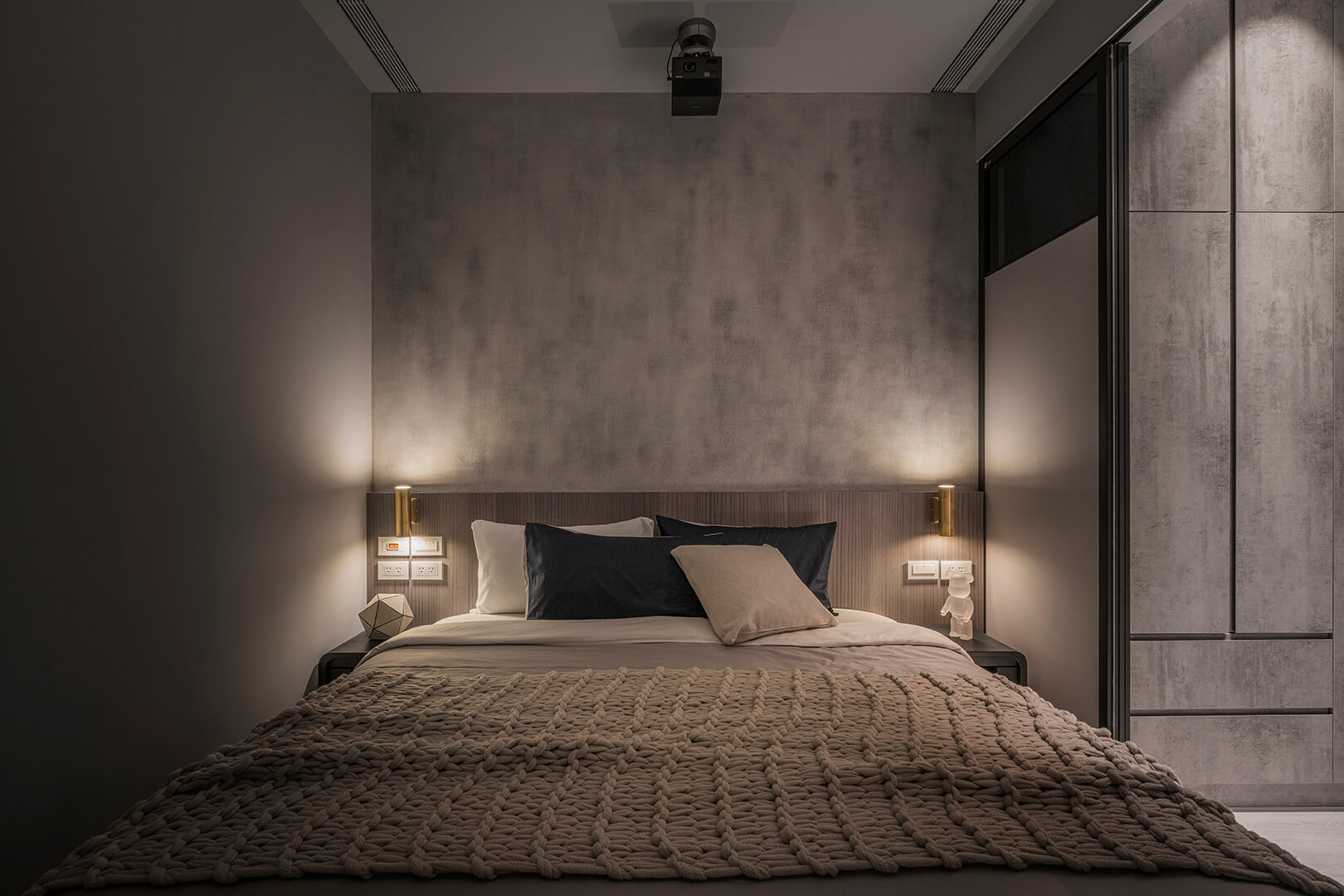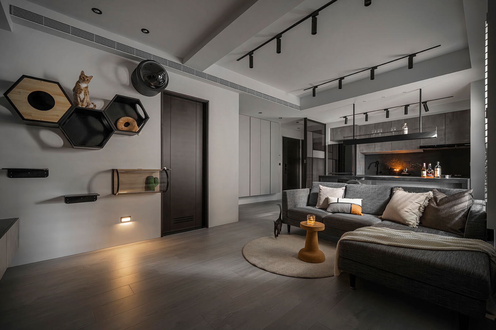 本案從客變開始幫屋主提早規劃出未來入住時的平面格局,區隔出玄關落塵區,也將LDK串聯在一起,讓玄關轉折進來屋內後有放大空間的視覺效果,原有兩房改成一主臥一小書房,讓公領域盡量放大,輔以黑白灰材質的搭配,揉合鐵件的黑,石材的灰,壁面的白,黃光點綴塑造出符合屋主的個性宅邸,也因為屋主有飼養三隻貓,搭配黑色系的貓跳台配件,讓整件作品色系風格更為一致。